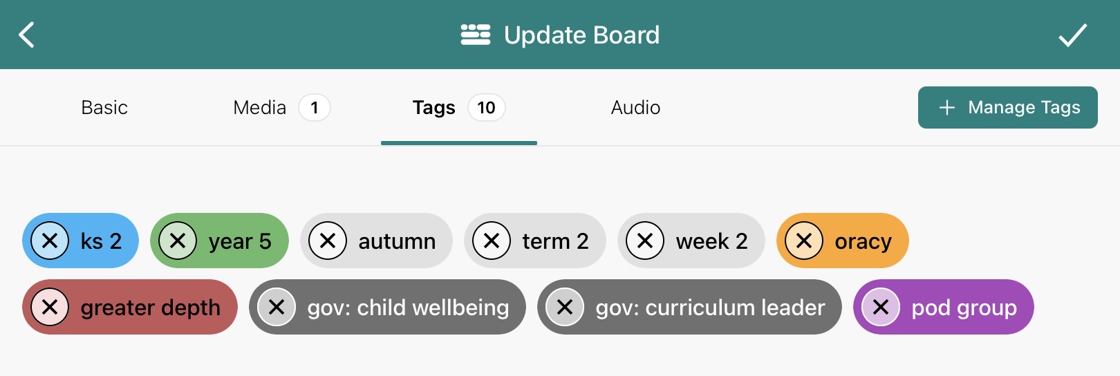 4. Have a quick check that everything you want to add is included now as part of this curriculum moment. Tap the 'tick' in the top right if you are happy to share. If you see a type error in your custom tag, just tap the 'x' to remove the it and then make another if needed.